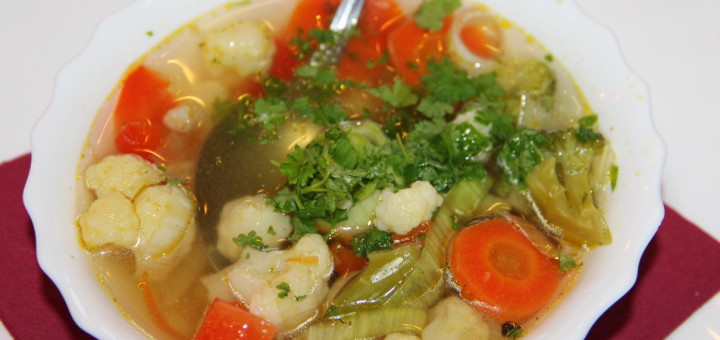 Когда бульон готов (овощи отдали все свои вкусные и полезные свойства), — вынимаем их из кастрюли. А в получившийся бульон кладем нарезанную кружками морковь, минут через десять — пятнадцать добавляем цветную капусту (предварительно разделив ее на мелкие соцветия). Еще через десять — пятнадцать минут отправляем в кастрюлю соцветия брокколи, и порезанный кусочками болгарский перец. Оставляем на среднем огне на пятнадцать — двадцать минут. Добавляем нашу чудесную заправку. Нарезаем лук порей кружками и отправляем в кастрюлю. Через десять минут снимаем с огня. Разливаем. Украшаем зеленью. Приятного аппетита!