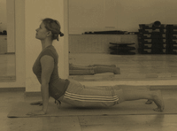 На вдохе выпрямите руки и выполните собаку мордой вверх. Поднимите грудную клетку вверх. Прижимайте к полу подъемы стоп. Интенсивно вытягивайте ноги. Направляйте копчик к пяткам и выталкивайте переднюю поверхность бедер вверх к потолку. Уводите плечи от головы. Смотрите прямо перед собой или чуть выше.