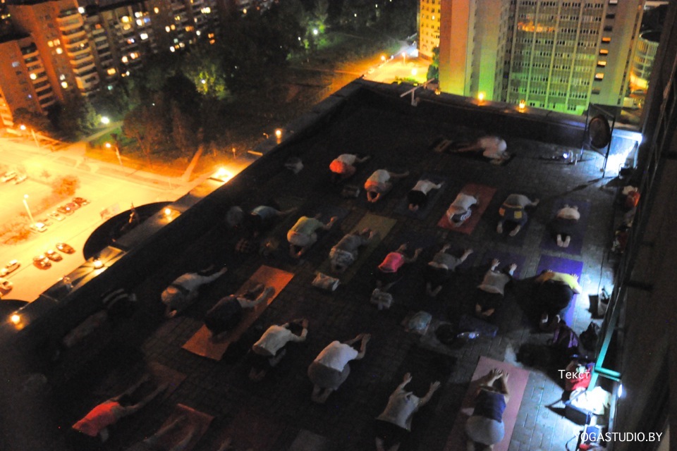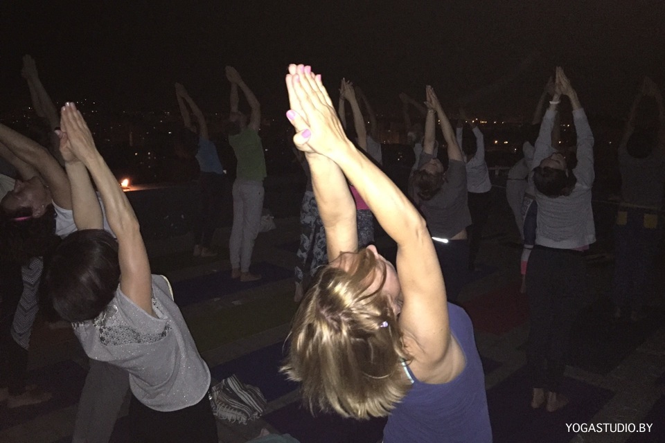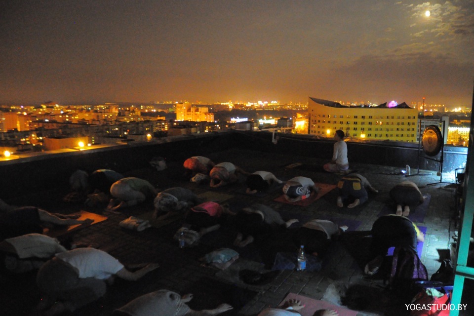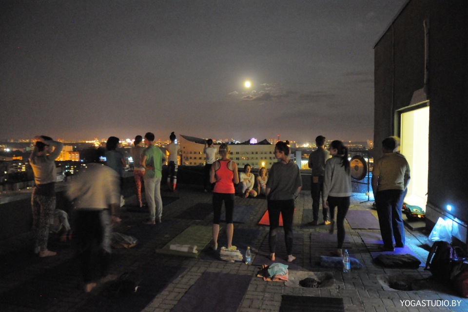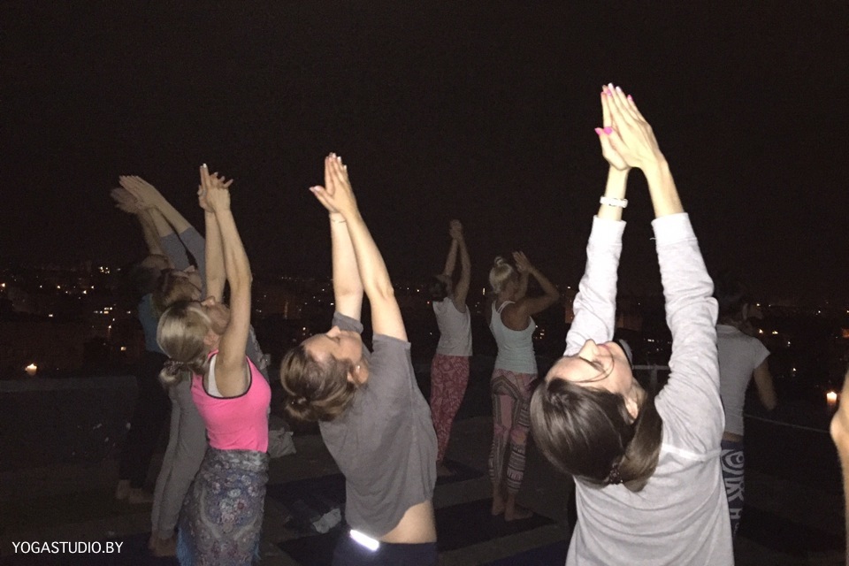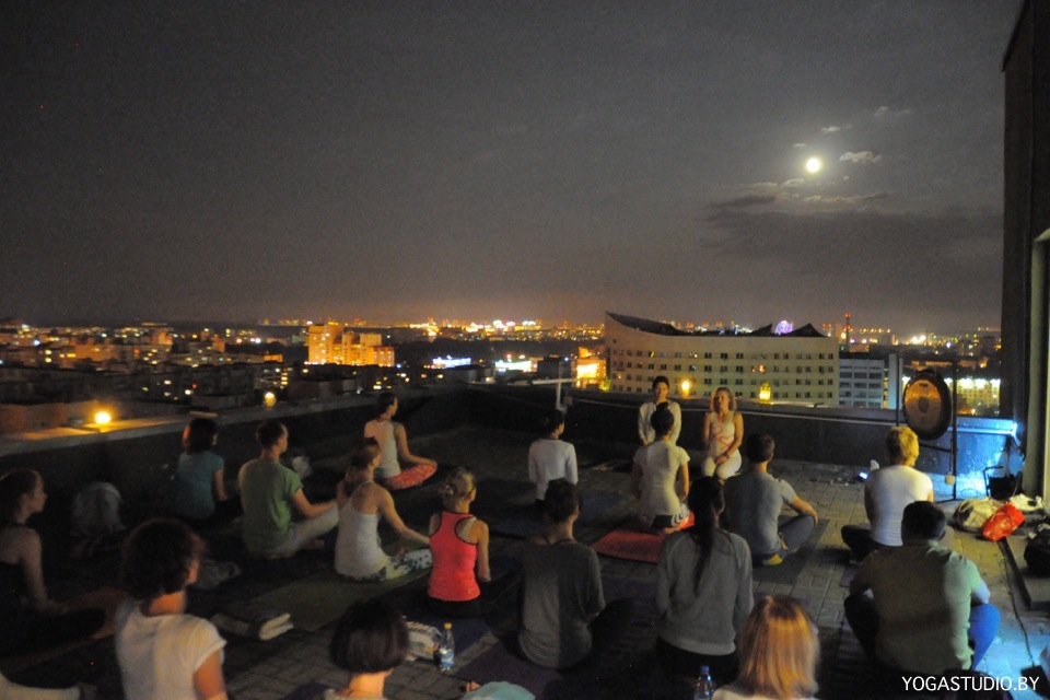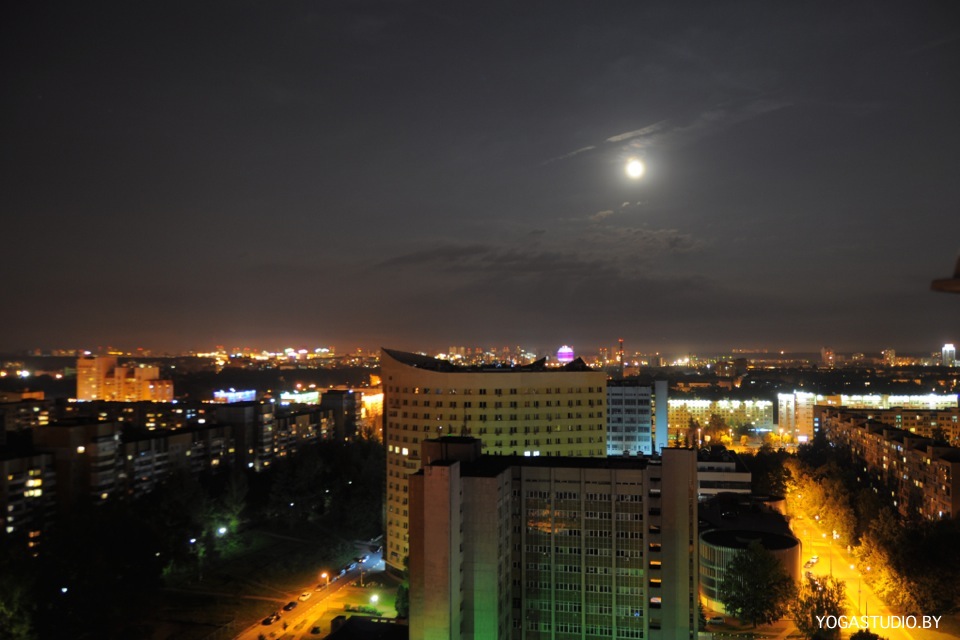 В этот раз мы собрались на крыше с видом на ночной Минск, чтобы приветствовать ее величество Луну, выполнив таинственную и чарующую Чандра Намаскар в потоке положительных эмоций. Лунная практика отличалась спокойствием и неторопливостью. Мы любовались видами ночного города и наслаждались умиротворением мерцающих звезд, а Луна казалось снисходительно нам улыбалась.