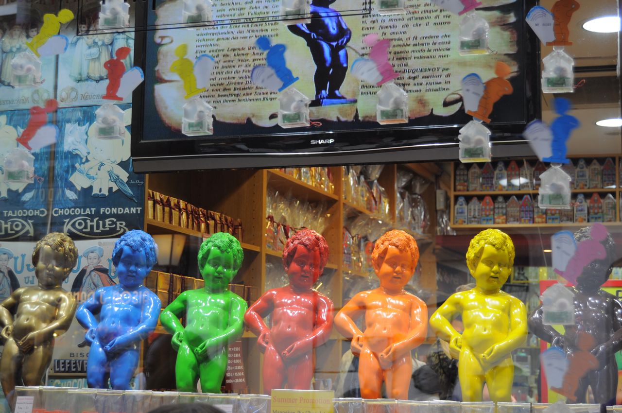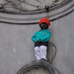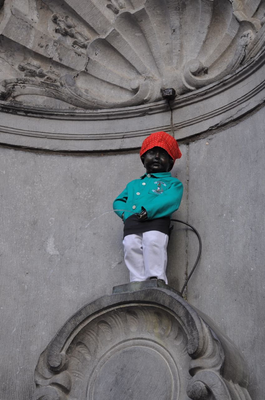 Пройдя славную улицу ресторанов, вскоре мы попали на главную площадь города. Гран-плас – площадь длиной 110 м и шириной 68 м. Её окружают дома, построенные в XVII веке. Каждый имеет своё название и каждый принадлежал когда-то определённой цеховой корпорации. Так, например, дом «Волчица» занимала гильдия стрелков из лука, дом «Тележка» — гильдия производителей масел и жиров. Гильдейские дома все разные, хотя и построенны в стилях барокко и в стиле Людовика ХIV. Это действительна одна из красивейших площадей Европы! У меня точно в прошлый раз было что-то с глазами! Затем отправляемся на поиски Того-Самого-Писающего-Мальчика. Маннекен Пис — знаменитый фонтан — Писающий Мальчик, бронзовая статуя высотой 61 см. Существует множество легенд о его появлении. Согласно одной из них, четыре века назад один мальчуган спас таким образом город от пожара. По-моему, очень милая легенда, такой маленький герой -писюха. Сегодня знаменитый на весь мир Писающий Мальчик — обладатель гардероба, состоящего более чем их восьмисот нарядов, которые хранятся в «Доме Короля». Так, в дни рождения Моцарта и Элвиса Пресли его наряжают в соответствующие костюмы, а во время международных матчей Маннекен Пис примеряет форму национальной сборной по футболу. Среди его костюмчиков имеется даже костюм космонавта, присланный из СССР.