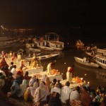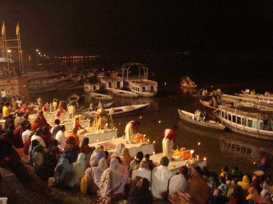 Вечером, если вы вновь вернетесь к Дасасвамедхгату, вы увидите церемонию благодарения Ганга. На деревянном помосте перед спуском к воде монахи в желко-карсных одеждах стучат в барабаны, раскачивают лампады и распевают мантры, сопровождая их танцами, особыми поклонами — пранамами и вознося их сначала в сторону реки, потом странам света, звездам и луне. Это завораживающее, красивое, но спустя полтора часа, выглядящее довольно монотонным действо, иногда с фальшивым многоголосием и бесконечными мантрами.